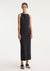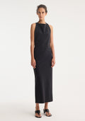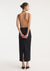 This open back dress offers a sophisticated silhouette perfect for evening events and special occasions. Featuring a high halter neckline with elegant tie detailing, it gracefully wraps around the neck and shoulder. The floor-length, body-fitting design is complemented by a dramatic open back and a subtle center back slit, ensuring both style and ease of movement.