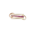 The Petunia Gold Pink Ombre ring showcases a central band adorned with pink ombre sapphires, framed by two solid 18K yellow gold bands. Connected by elegant yellow gold orbiting links, this sculptural design balances artistry with everyday wearability. Each piece is meticulously handcrafted in Los Angeles, offering a refined and unique accessory that complements sophisticated style effortlessly.