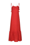The Poema Eterno Embroidered Maxi Dress features delicate slim tie straps and a scalloped, embroidered bust that adds refined detail. Its flowing dropped tier design in vibrant red linen offers effortless elegance and comfort, perfect for warm days or special occasions.