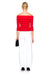 Red off-the-shoulder cardigan with horizontal stripes and pearl embellishments along the neckline. Versatile enough for casual or dressed-up occasions, this piece brings understated luxury to any wardrobe.