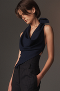 Luxurious satin meets modern edge in this sculptural halter top. The draped neckline flows with fluid elegance, while a sleek leather back strap adds striking contrast and contemporary attitude. This piece seamlessly transitions from refined evenings to bold daytime styling, offering the perfect balance of softness and sophistication for those who embrace understated luxury with an edge.