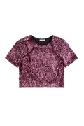This boxy cropped t-shirt features shimmering pink sequins covering the entire garment, adding a touch of sparkle to your look. A subtle gemstone detail on one shoulder enhances its elegant yet playful design, making it perfect for stylish casual wear or special occasions. Pair it with the Crystal Cluster Sequin Mini Skirt for a fabulous look.