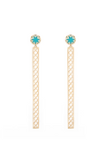 Delicate + understatedly chic, our ocean blue turquoise + polished 18-karat yellow gold starburst studs connect to simple yet elegant fishnet inspired bars. The beautiful contrast of the ocean blue turquoise + yellow gold create an effortless pop of color.