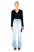 Black V-neck top in heavyweight crepe de chine with gathered neckline detailing, distinctive overlong cuffs, and exposed side seams for modern sophistication.